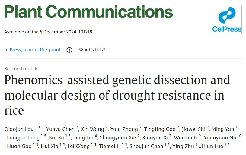 英文題目:Phenomics-assisted genetic dissection and molecular design of drought resistance in rice