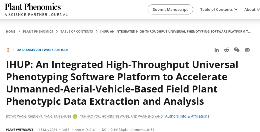 英文題目:IHUP: An Integrated High-Throughput Universal Phenotyping Software Platform to Accelerate Unmanned-Aerial-Vehicle-Based Field Plant Phenotypic Data Extraction and Analysis
