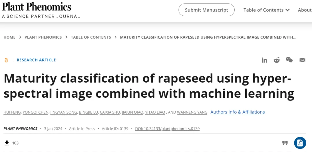 英文題目:Maturity classification of rapeseed using hyperspectral image combined with machine learning