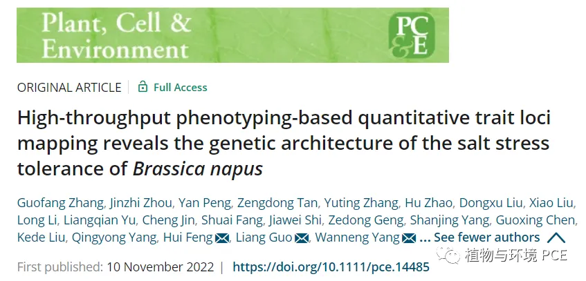 英文題目:High-throughput phenotyping-based QTL mapping reveals the genetic architecture of the salt stress tolerance of Brassica napus