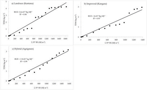 3個(gè)珍珠谷子品種(a)地方品種、(b)改良品種和(c)雜交種的累積干物質(zhì)產(chǎn)量(TDM)與部分截獲量和太陽輻射(FI × Rs)的累積乘積(∑)的關(guān)系。給出了輻射利用效率(RUE)和決定系數(shù)(R2)。FI值在測(cè)量當(dāng)天測(cè)定。