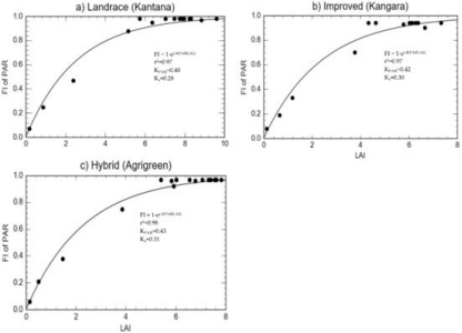 3個(gè)珍珠谷子品種(a)地方品種、(b)改良品種和(c)雜交品種葉面積指數(shù)(LAI)與光合有效輻射截集分?jǐn)?shù)(FI)的關(guān)系。給出了決定系數(shù)(R2),以及冠層光合有效輻射(KPAR)和太陽總輻射(Ks)的消光系數(shù)。
