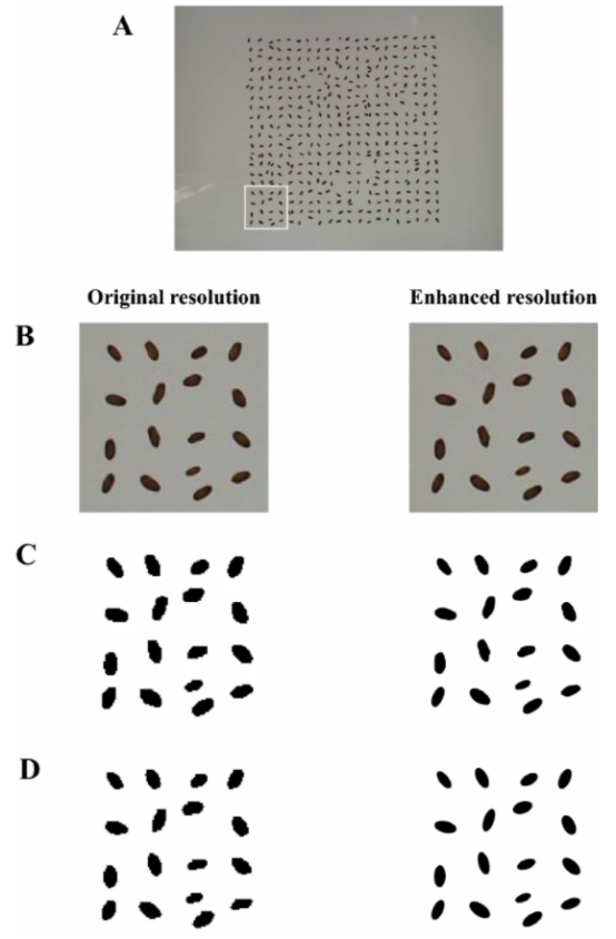 圖像分割輸出用于提取顆粒和擬合佳橢圓。A存檔中的一張圖片,包含 400 多粒小麥。例如,白框中的顆粒在圖中的下一部分進行處理。B 分辨率輸出增強;C 圖像分割的結(jié)果。兩種分辨率使用相同的閾值;D 將佳橢圓擬合到單個顆粒