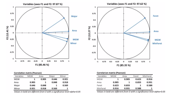 平均粒重 (MGW) 的主成分分析 (PCA) 和基本圖像衍生的粒度指標(biāo),即主要和 Feret(粒長指標(biāo))、次要和 Feret(粒寬指標(biāo))以及面積。顯然,顆粒寬度的一維指標(biāo)比面積的二維指標(biāo)更準(zhǔn)確地反映了 MGW 的變化。