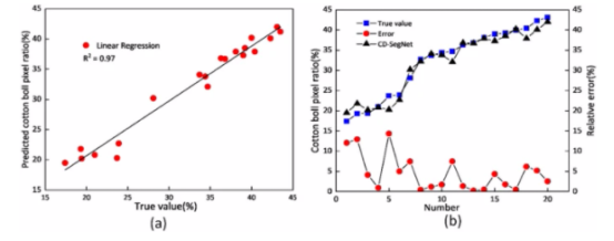 CD-SegNet分割結(jié)果與圖像中棉鈴面積比的比較。