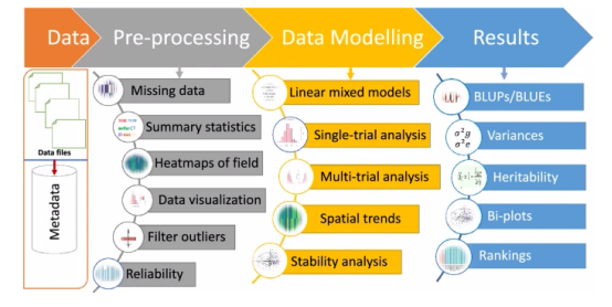 想要從數(shù)據(jù)中提取有意義的信息從而做出更好的育種決策,開發(fā)系統(tǒng)化的表型數(shù)據(jù)分析流程、增強(qiáng)可視化以及結(jié)果挖掘是至關(guān)重要的。在這里,作者概述了基于IRRI的旱作水稻育種(RRB)計(jì)劃,以及其如何利用 R 計(jì)算能力和R Markdown、plotly、LaTeX 和 HTML 等開源資源工具來開發(fā)開源和端到端的數(shù)據(jù)分析工作流程和方法,將其重新設(shè)計(jì)為可復(fù)制的文檔,以便提高數(shù)據(jù)解釋和結(jié)果可視化的能力,并實(shí)現(xiàn)輕松與合作者共享。