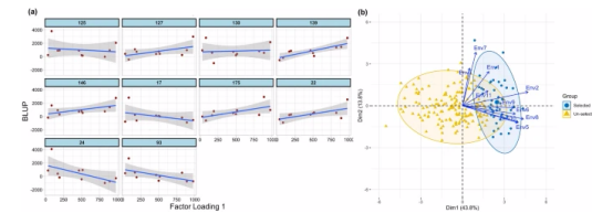 從 MET 分析中提取的結(jié)果。A.使用第一因子估計(jì)載荷的前 10 個(gè)基因型的潛在回歸圖。 藍(lán)色實(shí)線和灰色陰影分別對應(yīng)于潛在回歸線和 95% 的置信區(qū)間。 b 基于因子分析協(xié)方差結(jié)構(gòu)在所有環(huán)境中調(diào)整的預(yù)測育種值,繪制選定基因型(藍(lán)色)和未選定基因型(黃色三角形)的雙標(biāo)圖。 帶箭頭的藍(lán)線顯示環(huán)境及其相關(guān)性