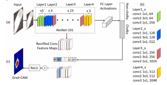 模型架構(gòu)--主干CNN(例如,ResNet-101)被訓(xùn)練來(lái)將輸入顆粒圖像分類(調(diào)整大小)為白堊色或非白堊色。RESNET-101有四組主要的卷積層,分別表示為層1、層2、層3和層4,分別由3、4、23和3個(gè)瓶頸塊組成。B每個(gè)瓶頸塊以1×1卷積層開(kāi)始和結(jié)束,中間有3×3層。每層中的過(guò)濾器數(shù)量顯示在內(nèi)核維度之后。C Grad-CAM使用白堊類別的梯度來(lái)計(jì)算卷積層中每個(gè)特征地圖的權(quán)重。在推斷時(shí),使用REU激活轉(zhuǎn)換的特征地圖的加權(quán)平均值被用作當(dāng)前圖像的熱圖