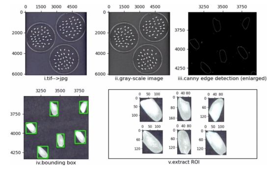 圖像預(yù)處理。用于從原始掃描圖像中裁剪單個(gè)水稻種子的步驟,每個(gè)種子大約有25-30個(gè)種子。五個(gè)步驟(一至五)。在說(shuō)明在各個(gè)步驟中實(shí)現(xiàn)的操作的每幅圖像下面描述了