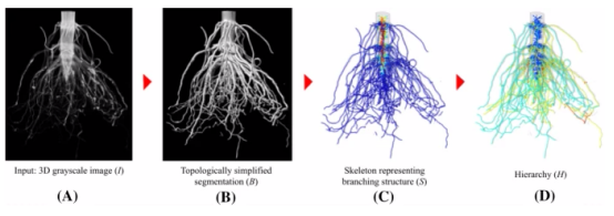 X射線、CT、MRI等三維成像技術(shù)已被廣泛應(yīng)用于植物根系結(jié)構(gòu)的研究。有許多計算工具可以從3D根部圖像中提取粗粒度特征,如總體積、根數(shù)和總根長。然而,目前還缺乏精確有效地計算細(xì)粒根系特征的方法,如每個層次的根數(shù)和幾何形狀。這些特性將使生物學(xué)家對根系結(jié)構(gòu)有更深入的了解。