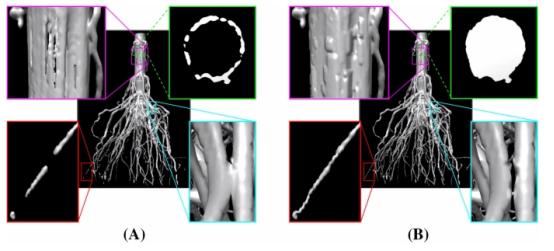 分割根圖像。對圖像I進(jìn)行閾值化會產(chǎn)生許多拓?fù)溴e誤,例如斷開連接(紅色框)和手柄(青色框和紫色框),并且莖內(nèi)部是中空的(綠色框)。B應(yīng)用我們的填充啟發(fā)式,然后使用[20]的算法,得到一個分段B,去除這些拓?fù)溴e誤,并填充莖部位。