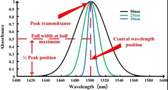 中心波長為1500 nm,帶寬為10、25、50 cm時的透光率曲線