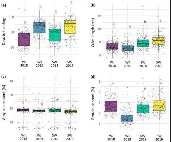 在兩個不同地點(WJ-Wanju;SW-Suwon)評估的 293 個韓國水稻品種在兩年內抽穗期 (a)、莖稈長度 (b)、直鏈淀粉含量 (c) 和蛋白質含量 (d) 的變化( 2018 年和 2019 年)。根據(jù) Tukey 多重比較,箱線圖上方的不同小寫字母表示在 p < 0.05 處存在顯著差異。