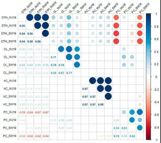 兩年間(2018 年和 2019 年)在兩個不同地點(WJ-Wanju;SW-Suwon)評估的 293 個韓國優(yōu)良水稻品種的抽穗天數(shù) (DTH)、稈長 (CL)、直鏈淀粉含量 (AC) 和蛋白質含量 (PC) 之間的相關性。下矩陣中顯示皮爾遜相關系數(shù)在p<0.01處顯著,上矩陣中每個圓圈的大小和粗細與相關系數(shù)成正比。