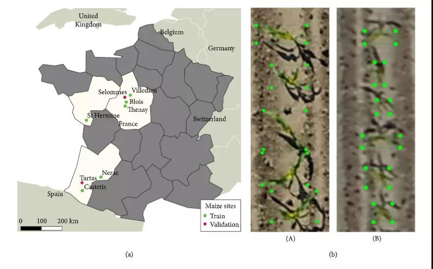 研究地點(diǎn)的位置,以從無人機(jī)獲取的玉米微區(qū)的提取為例。(A)一張地圖,顯示本研究中使用的位于法國西部的八個(gè)玉米表型平臺(tái)的位置。(B)圍繞玉米植株繪制的包圍框的圖解。所示的例子來自塔爾塔站點(diǎn)的(?GSD=0.27 cm)(A)與(??GSD=0.63 cm)(B)。