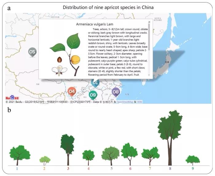 中國(guó)九種杏,01-09 代表九個(gè)品種:a 九個(gè)品種的分布、描述和圖片。b 九個(gè)品種的樹(shù)形及相對(duì)高度