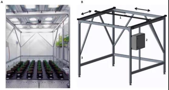 (A)Phenocave安裝在生物氣候室中,安裝了兩個(gè)成像傳感器,一個(gè)DSLR Canon EOS 和一個(gè)多光譜 MicaSense Altum;(B)示意圖Phenocave模型?;疑^表示XY坐標(biāo)上的移動(dòng)。