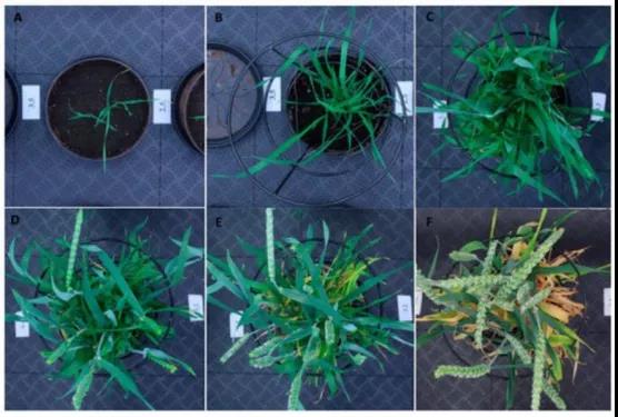 部分Phenocave的紅-綠-藍(lán)(RGB)未處理圖像。處于不同生長階段的春小麥植株:(A)幼苗,(B)分蘗,(C)莖伸長,(D)孕穗,(E)抽穗和(F)籽粒灌漿。