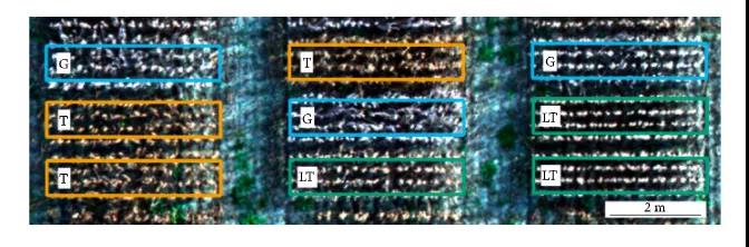 2019年10月15日,在加拿大安大略省圭爾夫市圭爾夫大學(xué)埃洛拉研究站,收獲成熟時(shí)(R8)大豆地塊(參考試驗(yàn))的真彩色航拍圖,顯示了短柔毛顏色的變化。G灰色短柔毛;LT淺黃褐色的短柔毛;T黃褐色的短柔毛。