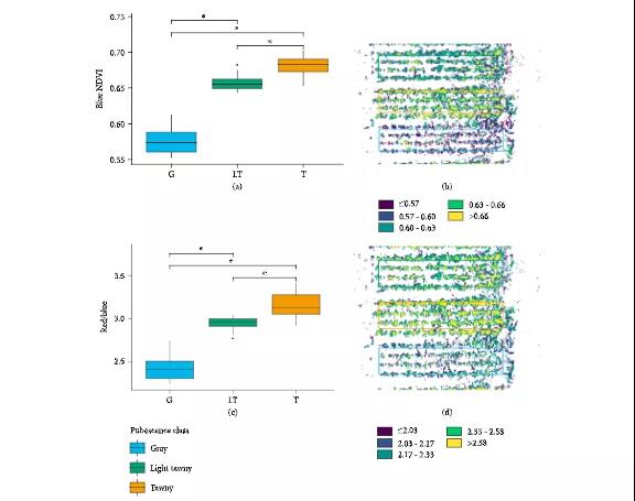 60 個(gè)大豆地塊的平均光譜指數(shù)值(a)藍(lán)色 NDVI、(b)藍(lán)色 NDVI 偽彩色圖、(c)紅色/藍(lán)色指數(shù)和(d)紅色/藍(lán)色偽彩色圖。 所有組彼此之間存在顯著差異(ANOVA,p<0.05,Tukey 比較)。