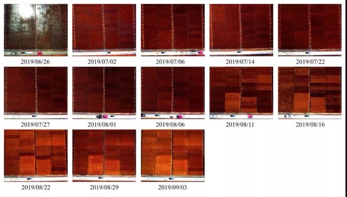 研究地點在整個生長季節(jié)拍攝的多光譜圖像(顯示了標(biāo)準(zhǔn)的假彩色合成圖像)
