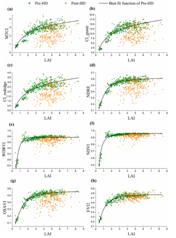 用a MTCI、b CIgreen、c CIred edge、d NDRE、e WDRVI、f NDVI、g OSAVI 和 h EVI2 繪制了整個生長季水稻葉面積指數(shù)的變化。在所有測試的VIs中,抽穗后(HD后)階段的樣本偏離了抽穗前(Pre-HD)階段的LAI與VI關(guān)系