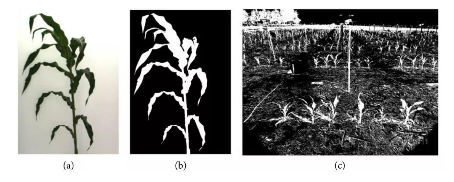 圖(c)是直接應(yīng)用于現(xiàn)場(chǎng)圖像的 K-means 算法的結(jié)果,該算法無法分離植物像素。