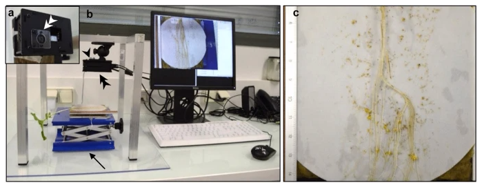 b:使用保護(hù)在盒子中的 Raspberry Pi 計(jì)算機(jī)(黑色箭頭)、面向根管的 Raspberry Pi/picamera(雙箭頭)、連接到屏幕、鍵盤,在根管中對 O. cumana 接種的向日葵根系進(jìn)行專用圖像采集設(shè)置 和鼠標(biāo)。實(shí)驗(yàn)室升降支架(箭頭)允許輕松調(diào)整聚焦和視野視圖以進(jìn)行成像。