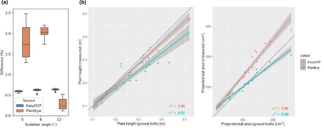 (a)使用EasyDCP和PlantEye激光掃描儀測(cè)量的標(biāo)尺長(zhǎng)度和實(shí)際長(zhǎng)度之間的差異。(b)相對(duì)于地面真實(shí)情況,計(jì)算y軸上繪制的植物高度和投影葉面積。黑線代表與地面真實(shí)情況的1比1測(cè)量