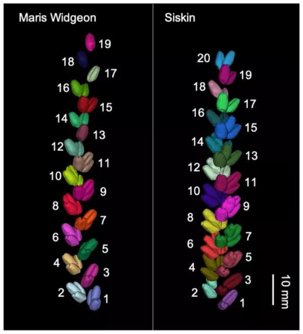 沿著Maris Widgeon(左)和Siskin(右)的穗的小麥小穗分布的三維可視化。同一小穗的谷物以相同的顏色顯示。數(shù)字表示小穗的順序是從小穗的底部到頂部