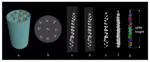 小麥穗粒CT掃描及圖像處理流水線實例。a有9個小麥穗的樣本架,b重建的CT體積的橫截面,c分離的小麥穗的縱向截面,d重新定向的小麥穗,e谷物的分割,f谷物的3D可視化,g在同一小穗中顯示相同顏色的小麥小穗可視化