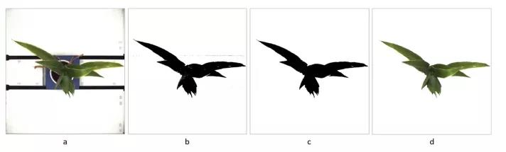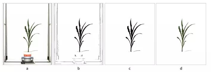 a原始圖像;b初步二值掩模圖像;c優(yōu)化的掩模圖像;d前景RGB圖像