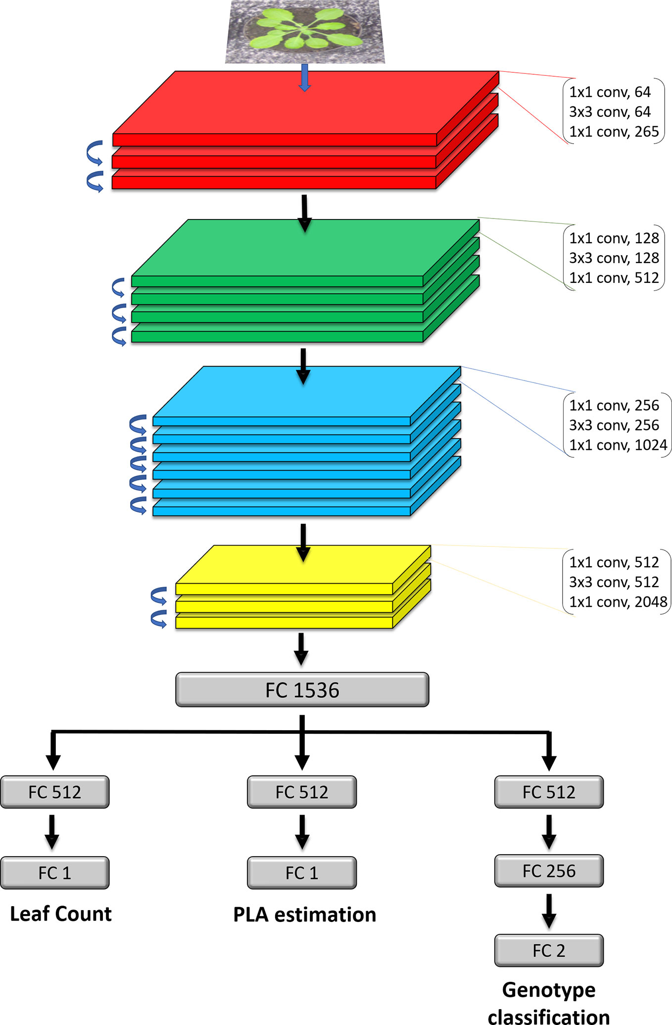 基于圖像的植物表型一直在穩(wěn)步增長,這急劇增加了對需要能夠評估多種植物性狀的更有效圖像分析技術(shù)的需求。深度學習已經(jīng)在植物表型的許多視覺任務中顯示出它的潛力,例如分割和計數(shù)。本文展示了如何使用多任務學習(MTL)從植物圖像中同時提取不同的表型性狀。MTL利用包含在相關(guān)任務的訓練圖像中的信息來改善整體泛化并學習帶有較少標簽的模型。本文作者提出了一種用于植物表型的多任務深度學習框架,該框架能夠同時推斷出三個特征:(i)葉數(shù),(ii)投影葉面積(PLA)和(iii)基因型分類。作者采用一個改進的預訓練ResNet50作為特征提取器,對其進行端到端的訓練以預測多個性狀。還利用MTL表明,通過學習更容易獲得的注釋(如PLA和基因型),可以預測更好的葉數(shù)(更難獲得注釋)。作者在幾個公開的擬南芥頂視圖圖像數(shù)據(jù)集上評估了此發(fā)現(xiàn)。