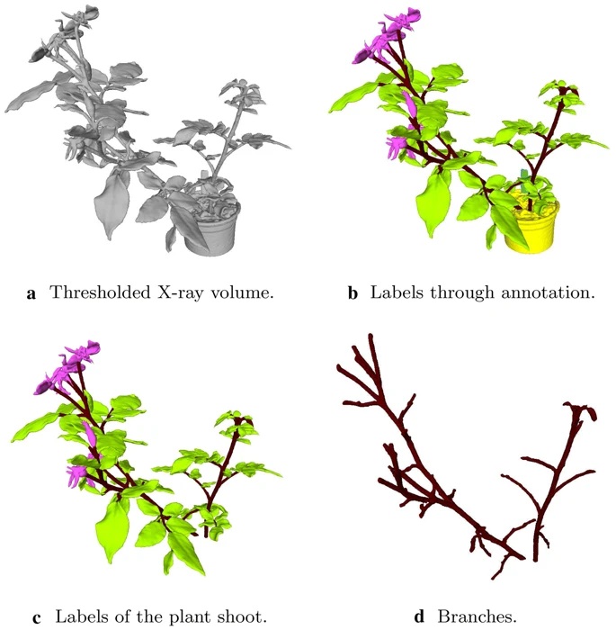 數(shù)據(jù)集中的rosebush模型示例。對原始的X射線體積進行閾值處理和掩碼處理,得到如圖a所示的實體部分。體積中的每個體素被注釋為葉、莖、花、盆或標簽,以獲得如b所示的地面真實分割。c中,只顯示了植物地上部分,不包括花盆和標簽。d中顯示了只與莖類對應的體素。