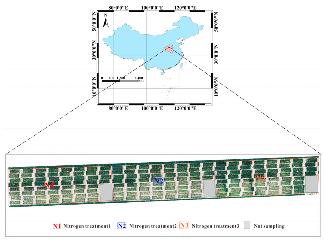 圖1 試驗(yàn)地區(qū)與小區(qū)。3種不同氮處理下的冬小麥種植于中國(guó)農(nóng)業(yè)科學(xué)院新鄉(xiāng)綜合試驗(yàn)基地。