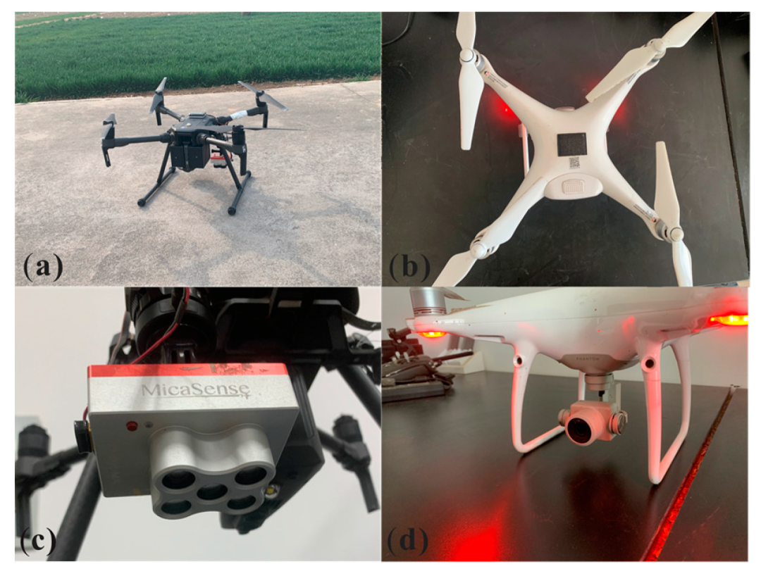 圖3 采集數(shù)據(jù)的無人機(jī)設(shè)備。(a) DJI M210,(b) DJI Phantom 4 Pro,(c)紅邊MX多光譜傳感器,(d) RGB 傳感器。