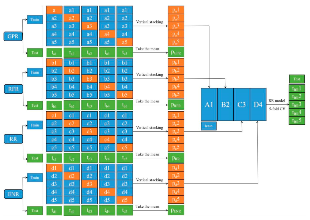 圖4 集成學(xué)習(xí)模型框架。GPR高斯過程回歸、RFR隨機(jī)森林回歸、RR嶺回歸、ENR彈性網(wǎng)絡(luò)回歸,不同模型的p個(gè)預(yù)測(cè)。