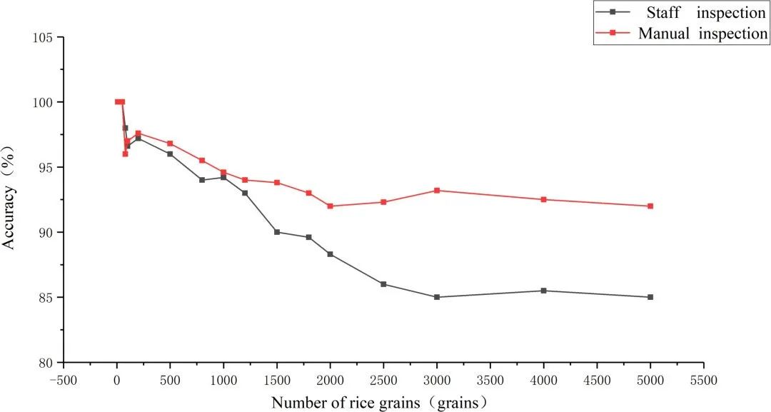 實(shí)驗(yàn)結(jié)果表明,該系統(tǒng)的分辨率可達(dá)92.3 %。該系統(tǒng)在稻米外觀品質(zhì)檢測(cè)過(guò)程中,不僅減少了因檢測(cè)環(huán)境不同導(dǎo)致的主觀性問(wèn)題、大樣本量導(dǎo)致的視覺(jué)疲勞以及檢測(cè)人員的個(gè)人因素,而且顯著提高了檢測(cè)精度,增強(qiáng)了稻米外觀品質(zhì)檢測(cè)效率和等級(jí)判定。從而實(shí)現(xiàn)了稻米外觀品質(zhì)的自動(dòng)化、科學(xué)化、精確化檢測(cè),成為傳統(tǒng)檢測(cè)方法的良好替代品,對(duì)大米產(chǎn)業(yè)的發(fā)展具有積極意義。