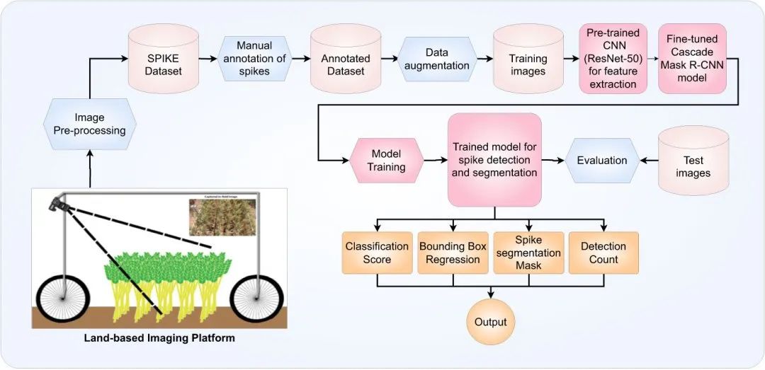 圖2 研究路線圖。描述了所提出的算法在田間圖像中檢測(cè)和分割小麥穗的工作流程。