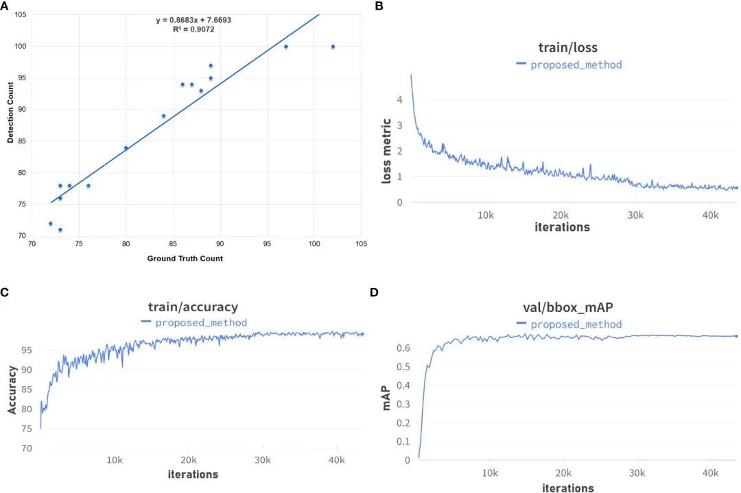 圖10 總體性能:( A )決定系數(shù),真實(shí)值與檢測(cè)計(jì)數(shù)值的比較;( B )訓(xùn)練過(guò)程中的損失度量,超過(guò)150 epochs的訓(xùn)練損失;( C ) 超過(guò)150 epochs的訓(xùn)練精度;( D ) 超過(guò)150 epochs的驗(yàn)證集mAP。