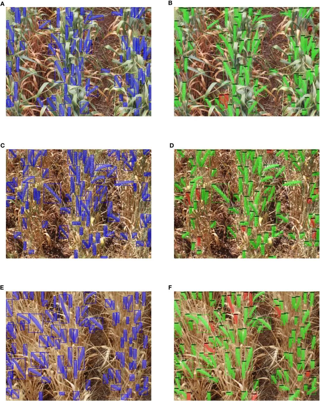 圖11 不同生長(zhǎng)階段測(cè)試圖像真實(shí)值與檢測(cè)結(jié)果的可視化示例。( A ) GSGC真值圖;( B ) GSGC檢測(cè)結(jié)果;( C ) GSYC真值圖;( D ) GSYC檢測(cè)結(jié)果;( E ) YSYC真值圖;( F ) YSYC檢測(cè)結(jié)果。
