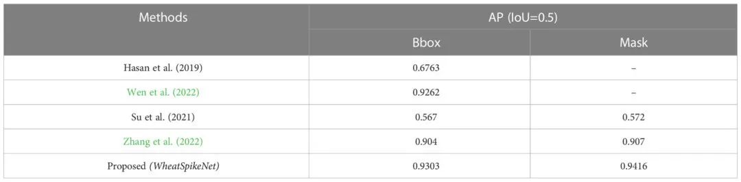 為了評(píng)估這些組件的單獨(dú)和組合對(duì)模型性能的影響,設(shè)置了一個(gè)基于ResNet50網(wǎng)絡(luò)骨干的基線架構(gòu),圖像尺寸為1333 × 800,batch size為2,LR為0.00125 (除非另有規(guī)定)。結(jié)果顯示,對(duì)于測(cè)試集,包含所有不同組件的版本在IoU = 0.5時(shí)獲得了最佳AP(平均精度),Bbox和Mask的AP分別為0.9303和0.9416。設(shè)定IoU閾值為0.5,統(tǒng)計(jì)每張圖像的TP,F(xiàn)P和FN,結(jié)果表明,該模型在測(cè)試圖像中平均準(zhǔn)確率達(dá)到了86 %,平均F1分?jǐn)?shù)為0.93。此外,與其他現(xiàn)有的架構(gòu)和策略相比,所提出的模型在穗檢測(cè)中mAP提高了0.41%,在穗分割任務(wù)中mAP提高了3.46%。由此可見(jiàn),本研究所提出的小麥穗模型WheatSpikeNet為從田間圖像中準(zhǔn)確分割小麥穗提供了高精度、高效、穩(wěn)定的方法,對(duì)未來(lái)小麥測(cè)產(chǎn)工作具有重要意義。
