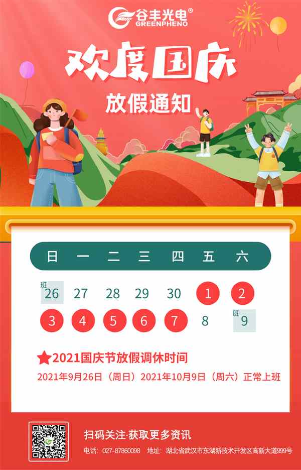 根據(jù)《國(guó)務(wù)院辦公廳關(guān)于2021年部分節(jié)假日安排的通知》,并結(jié)合公司的實(shí)際情況,現(xiàn)將武漢谷豐光電科技有限公司2021年國(guó)慶節(jié)放假安排通知如下: