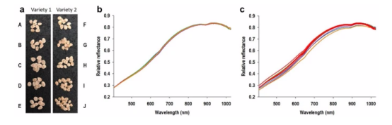 本研究中包括的番茄種子的圖像和平均反射率分布。來自兩個品種 A 和 B 的番茄種子照片,以及每個品種的五個子樣本 (a)。本研究中番茄種子品種1 (B)和2 (c)的五個子樣本的平均反射率分布。