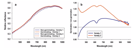 發(fā)芽和非發(fā)芽種子的平均反射率分布。品種 1 和 2 (a) 中未發(fā)芽和發(fā)芽的番茄種子的平均分布,以及品種 1 和 2 (b) 的發(fā)芽(發(fā)芽/未發(fā)芽)的相對影響