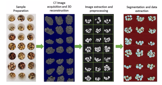 已知整個高粱籽粒的結構特征會影響最終使用質量,但對該結構的傳統(tǒng)評估是二維的(即,籽粒的橫截面)。目前的技術為考慮谷物的三維結構特征提供了可能性。X射線計算機斷層成像(CT)提供了這樣一種機會,可以從谷粒穎果中無損地提取定量數(shù)據(jù),然后這些數(shù)據(jù)可以與最終使用質量相關。