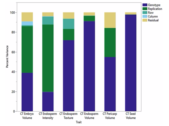 19個基因型的高粱籽粒結構CT估計值中與因子相關的百分比方差。復制指的是獨立的CT掃描,而行和列指的是CT機內的空間位置