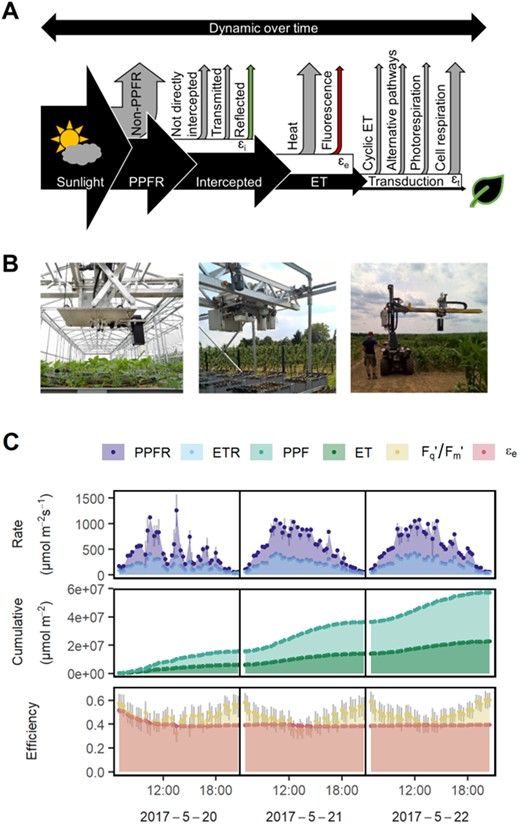 使用高通量測量方法估計(jì)了在波動條件下從陽光能源生產(chǎn)生物量的效率。A,陽光能量經(jīng)過多次轉(zhuǎn)化,直到積累成生物量。在波動條件下發(fā)生的能量損失是高度動態(tài)的。首先,從全光譜的陽光輻射中,只有PPFR可以被植物色素吸收。其次,光攔截效率(?i)取決于通過植物密度和樹冠的反射和透射光。因此,?i定義為給定區(qū)域內(nèi)冠層頂部和底部的PPFR比率。第三,通過測量ET得出截獲的光能到光化學(xué)能(?e)的轉(zhuǎn)換效率。熱量和ChlF的損失取決于光保護(hù)馴化和實(shí)際光強(qiáng)度。非光合色素的光吸收可以忽略不計(jì)。最后,轉(zhuǎn)化為生物量(?t)的效率取決于用于電子替換途徑、ET循環(huán)、光呼吸和細(xì)胞呼吸(包括碳水化合物的生物合成)的傳輸電子的數(shù)量。B,自動LIFT系統(tǒng)以高時空分辨率掃描溫室內(nèi)外以及田間的植物冠層。通過活性ChlF評估波動條件下的動態(tài)ET,揭示光系統(tǒng)II(Fq'/Fm')的運(yùn)行效率。使用內(nèi)置光譜儀另外測量反射率。C,分別使用LIFT和環(huán)境傳感器測量波動Fq'/Fm'和PPFR。顯示了大豆中連續(xù)三個測量日的子集。我們推導(dǎo)了ETR并計(jì)算這3天的累積ET和PPF,由累積ET和PPF的比率得到了生長期間的?e。灰色誤差條顯示了指定3天的所有測量中每15分鐘周期的平均值的標(biāo)準(zhǔn)偏差(n=113-543;大豆基因型的總n=36,891個測量值)。