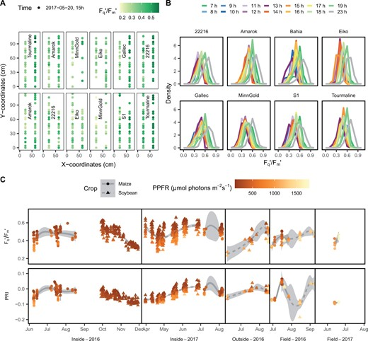 自動表型系統(tǒng)以高時空分辨率捕捉動態(tài)玉米和大豆基因型的光合作用。A,顯示了2017年5月20日15時測量的不同大豆基因型的光系統(tǒng)II運(yùn)行效率(Fq'/Fm')的空間變化。顯示了前12個生長容器的數(shù)據(jù)。使用兩個LIFT設(shè)備每小時掃描兩條線路中的容器。B,一天(2017年5月20日)每小時不同基因型的Fq'/Fm'分布。C,顯示了在溫室內(nèi)外的容器中以及在田間中超過2年測量的Fq'/Fm'和PRI?;疑`差條顯示平均每小時和作物的標(biāo)準(zhǔn)誤差(SE)(n=1–1079,玉米:總n=25,014,大豆:總n=220,881)。