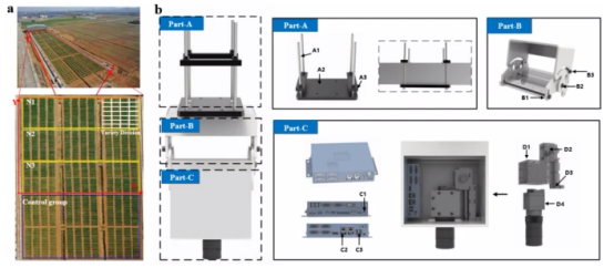 a田間移動(dòng)表型艙和小麥區(qū)劃;b RGB凍害系統(tǒng)硬件概述
